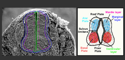 se divide en regiones de la placa alar y basal, que son precursores de las